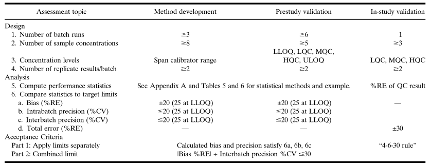 如認為方法可以接受,建議運行間精密度(%CV)和絕對平均偏差(%RE)均須 ≤20%(LLOQ 為25%)。此外,建議將方法總誤差(%CV和絕對%RE的總和)定為≤30%(LLOQ為40%),以符合研究中驗證的接受標(biāo)準(zhǔn)。